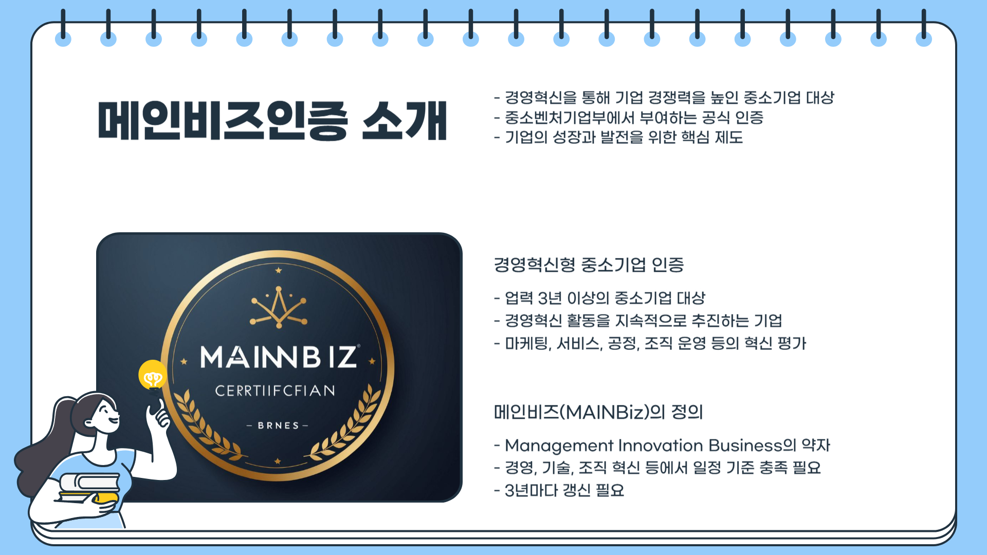 **메인비즈(MAINBiz)**는 Management Innovation Business의 줄임말로, 경영 혁신을 통해 기업의 경쟁력을 높인 중소기업을 대상으로 부여하는 인증입니다. 쉽게 말해, 경영혁신형 중소기업을 발굴하여 성장 가능성을 인정하고, 다양한 정책적 지원을 제공하는 제도입니다.