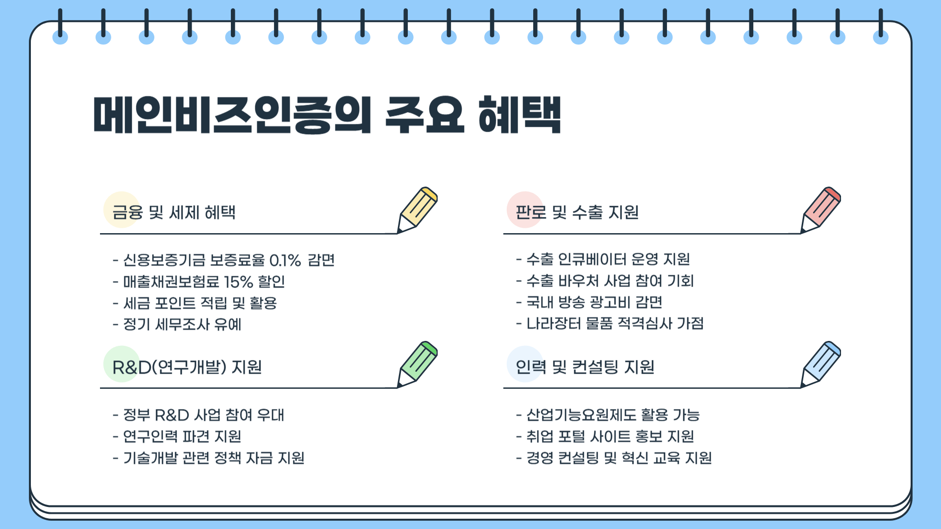 메인비즈인증은 기업이 경영 혁신을 인정받고, 다양한 정부 지원을 받을 수 있는 핵심 제도입니다. 금융, 세제, 판로, R&D, 인력 지원 등 기업 성장에 필수적인 혜택이 많기 때문에, 인증을 취득하고 활용하는 것이 매우 중요합니다.