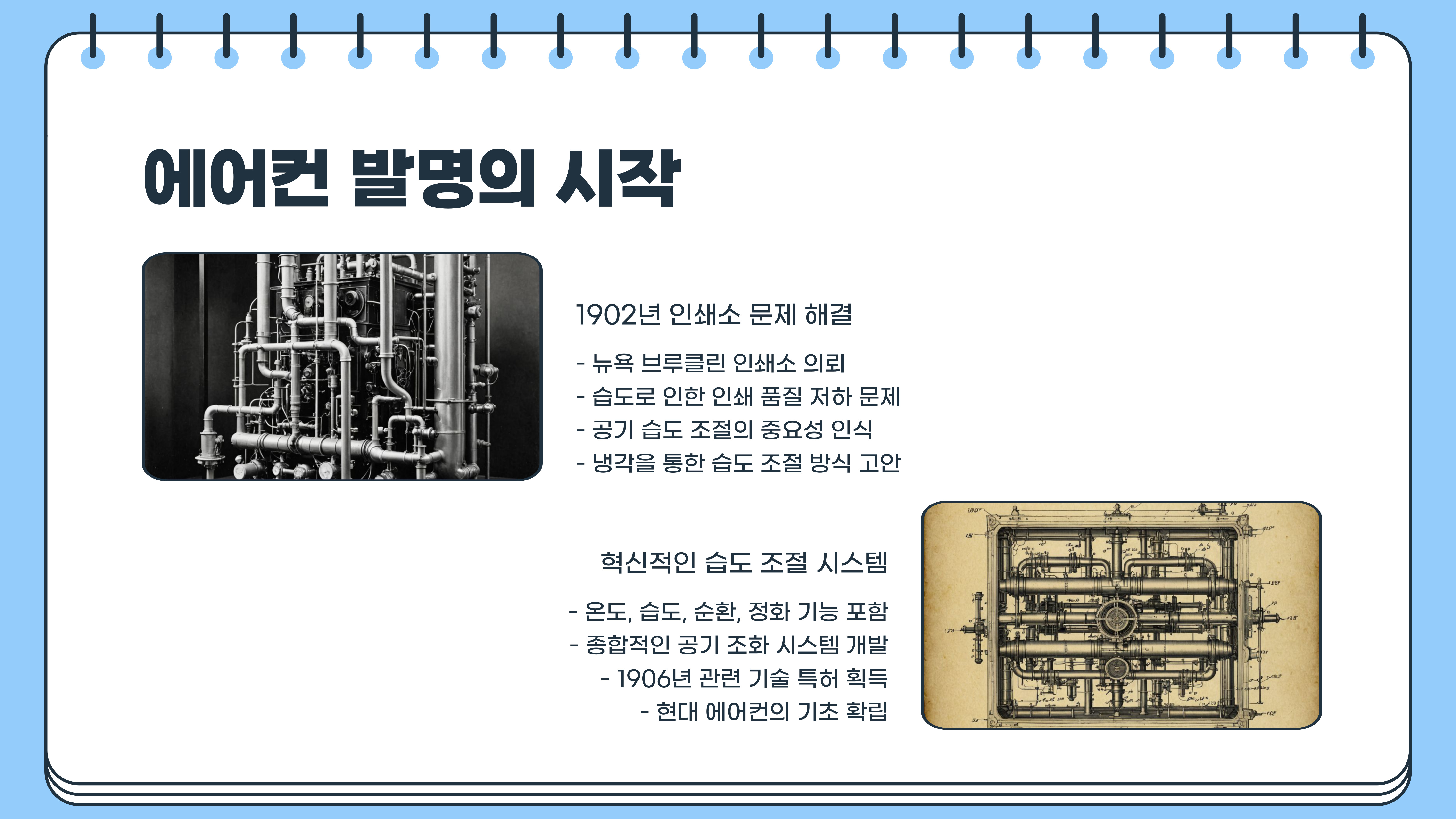 이 발명품은 단순한 온도 조절 장치가 아니라, 공기의 온도, 습도, 순환, 정화 기능을 모두 포함하는 종합적인 시스템이었죠. 이후 1906년, 캐리어는 해당 기술의 특허를 획득하며 본격적으로 에어컨 발명의 역사를 써 내려가기 시작합니다.