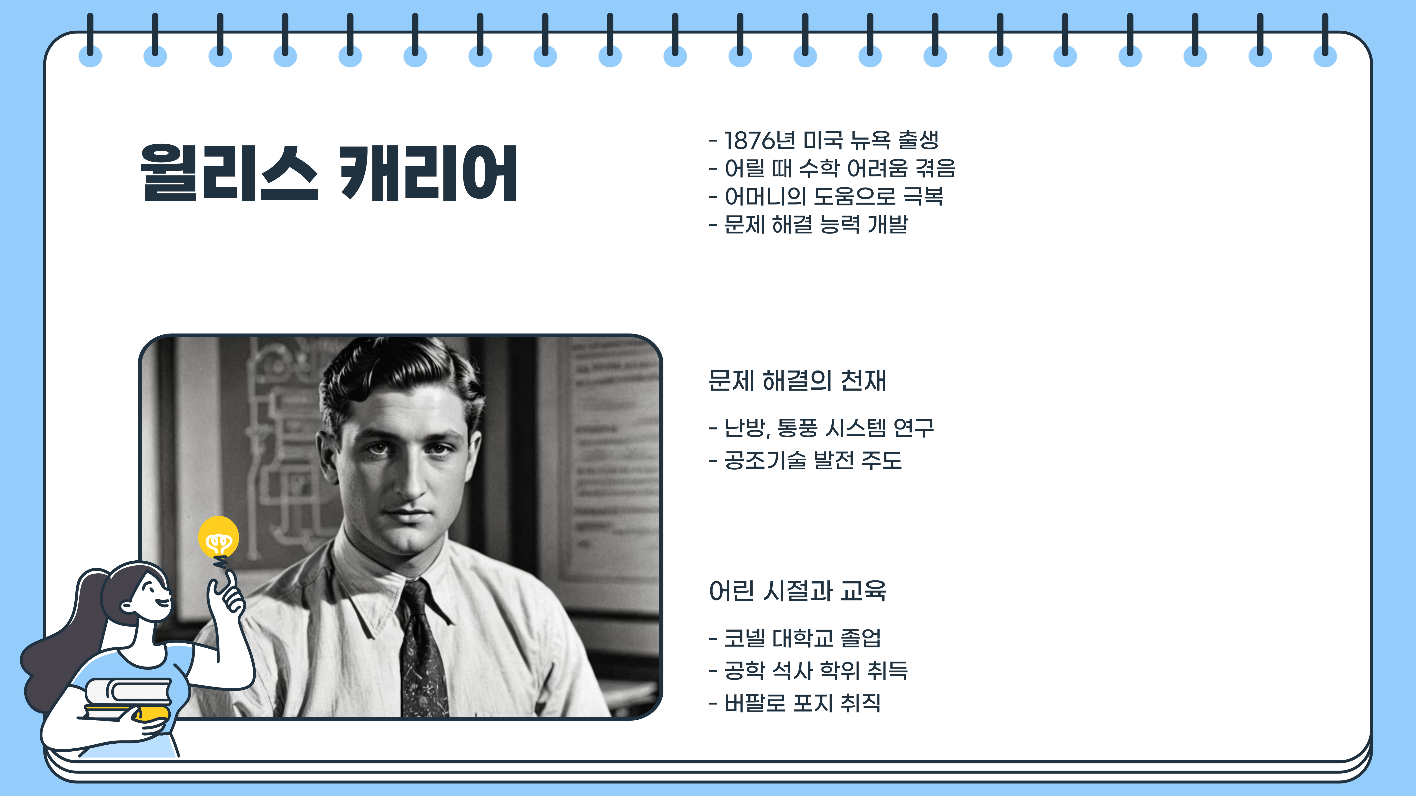 윌리스 하빌랜드 캐리어는 1876년 11월 26일, 미국 뉴욕 앙골라에서 태어났습니다. 그가 어릴 때부터 천재적인 두뇌를 가지고 있었냐고요? 아닙니다. 오히려 수학을 어려워했던 평범한 아이였죠. 9살 때까지 분수의 개념을 이해하지 못했던 캐리어는 어머니 덕분에 이를 극복하게 됩니다.