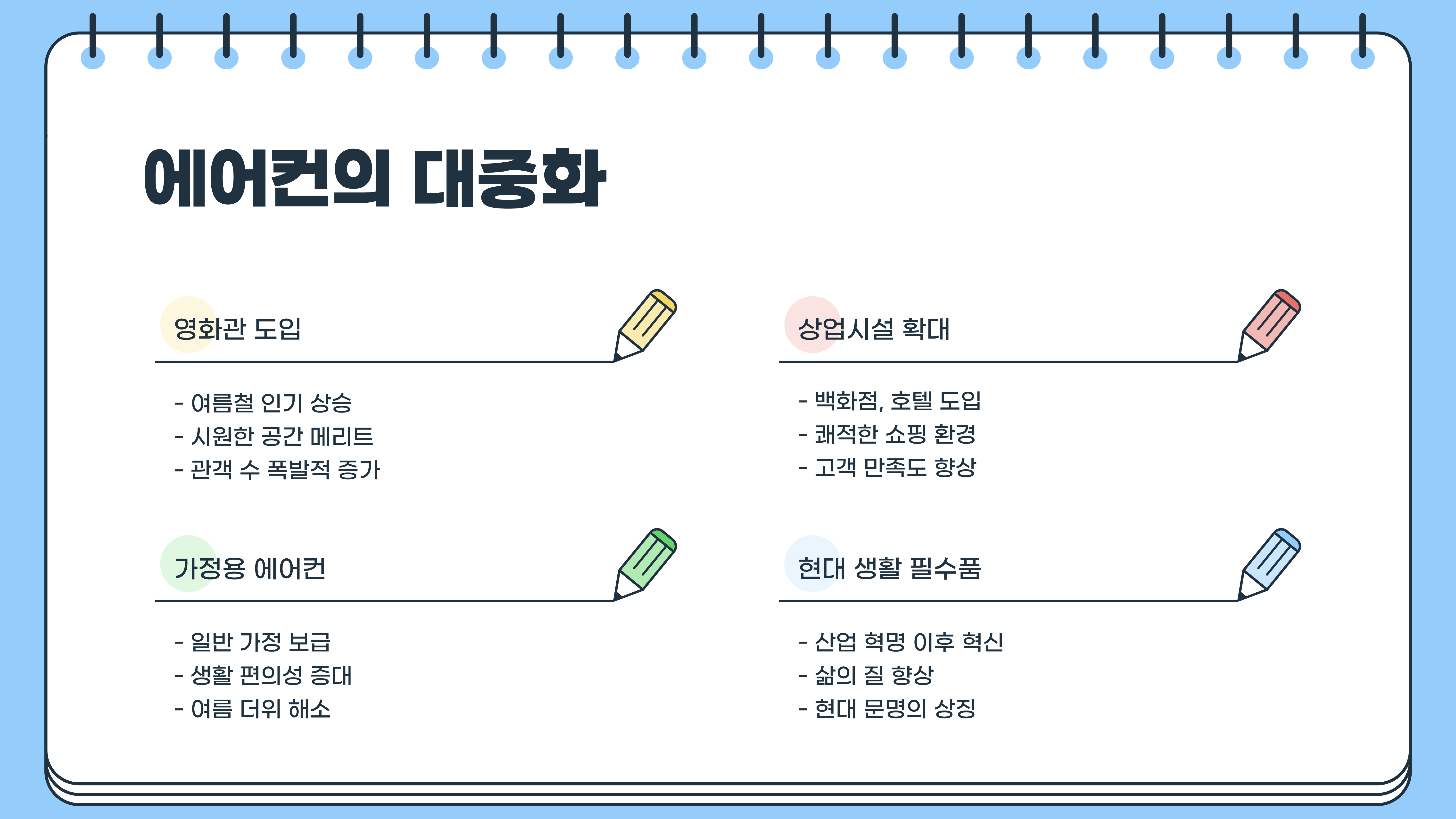 이후 사무실, 호텔, 백화점, 병원 등 여러 공간으로 확대되었고, 마침내 가정용 에어컨이 등장하면서 일반 가정에서도 사용할 수 있는 필수 가전제품으로 자리 잡게 됩니다.