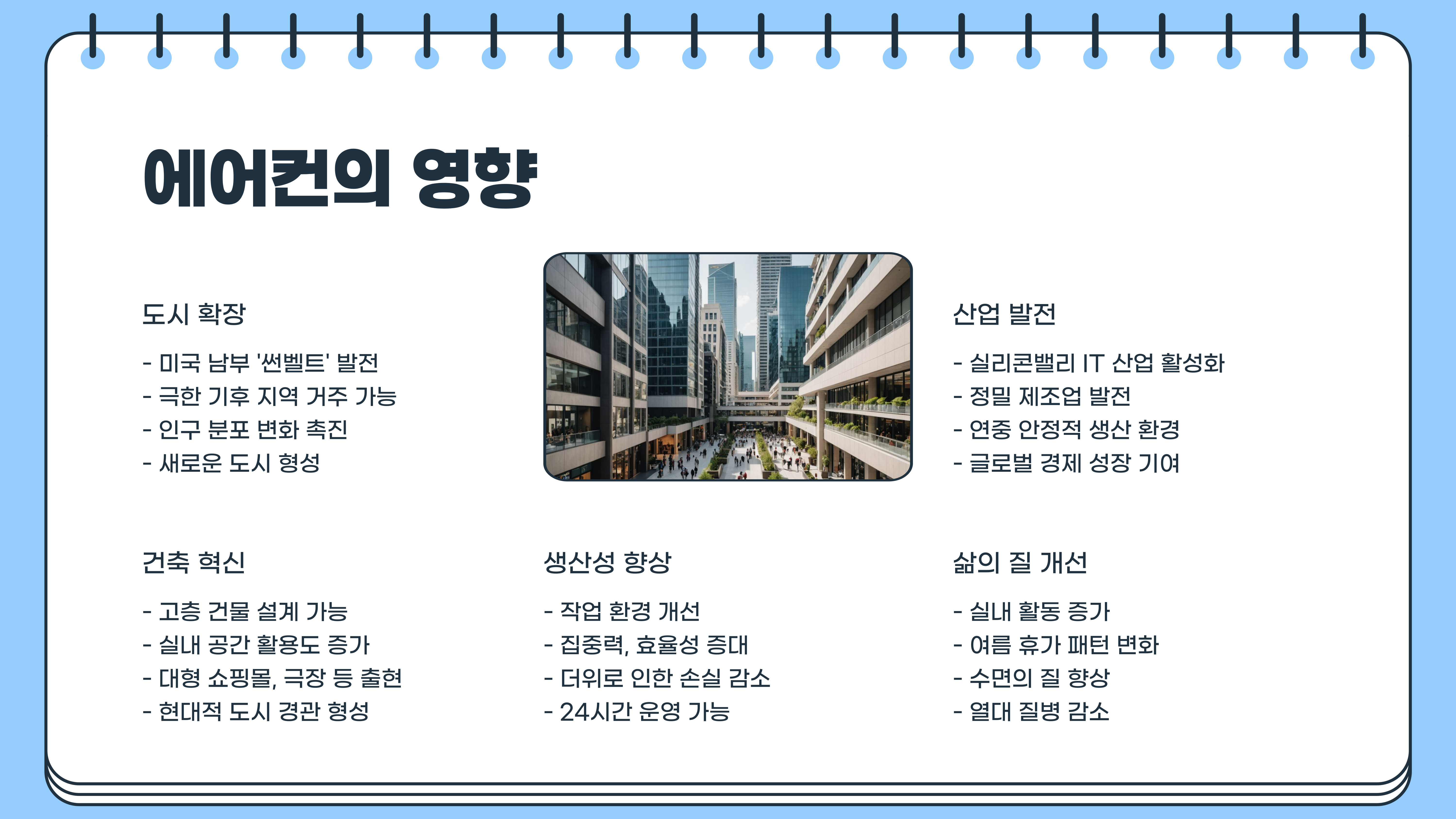 - 미국 남부의 ‘썬벨트’(텍사스, 플로리다, 애리조나 등) 지역은 원래 사람이 살기에 너무 더운 곳이었지만, 에어컨 덕분에 사람이 거주할 수 있는 환경이 조성되었죠.