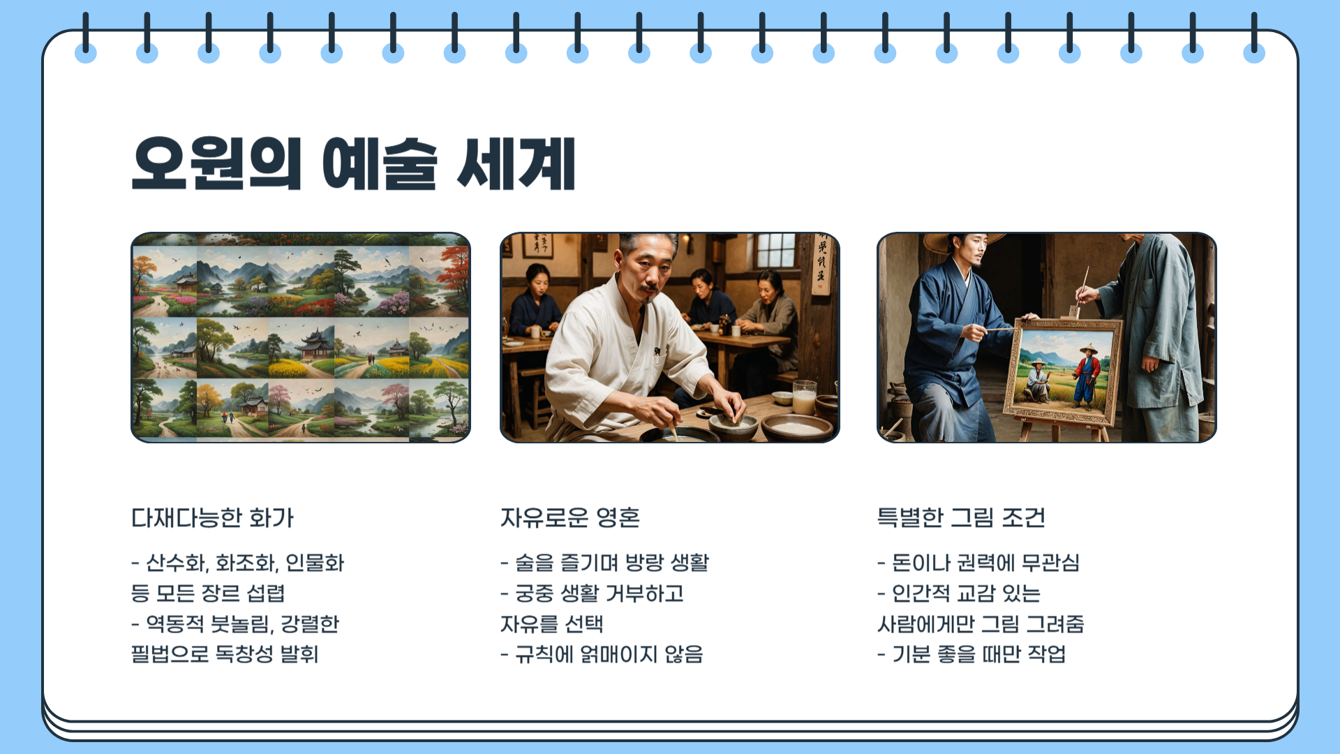 안녕하세요! 오늘은 조선 말기 가장 독창적인 화풍을 지닌 화가이자, 자유로운 영혼으로 살아간 오원 장승업에 대해 이야기해보려고 합니다. 그는 학문적 교육을 받지 못했지만, 타고난 재능과 감각만으로 조선 미술사에서 빼놓을 수 없는 거장이 되었습니다.